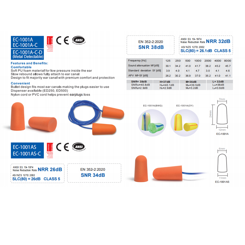 Designul cu glonț pentru majoritatea canalelor urechii, facilitează utilizarea dopurilor Dispenser disponibil (ED250, ED500)Cordonul de nailon sau cordonul din PVC ajută la prevenirea pierderii dopurilor de urechi