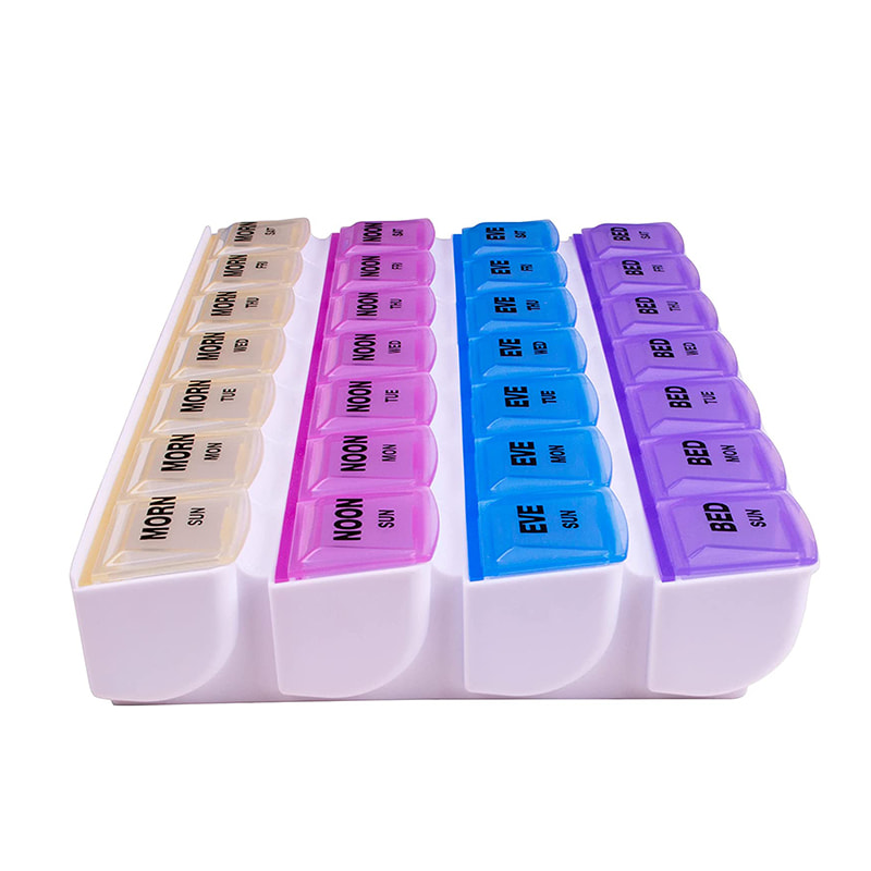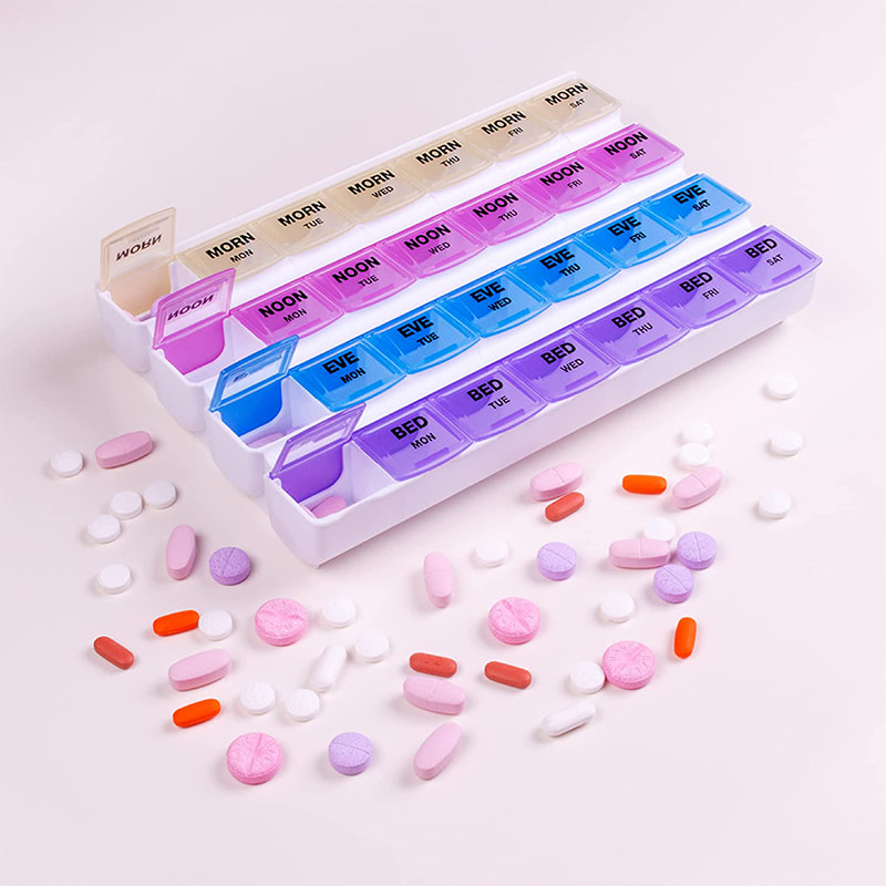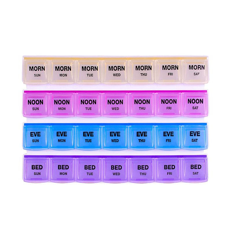 Această cutie de pastile de 7 zile vă permite să organizați medicamentele pentru dimineața, după-amiaza, seara și ora de culcare. Capacele cu coduri de culoare, transparente și ușor de deschis facilitează verificarea dacă ați organizat și ați luat corect pastilele