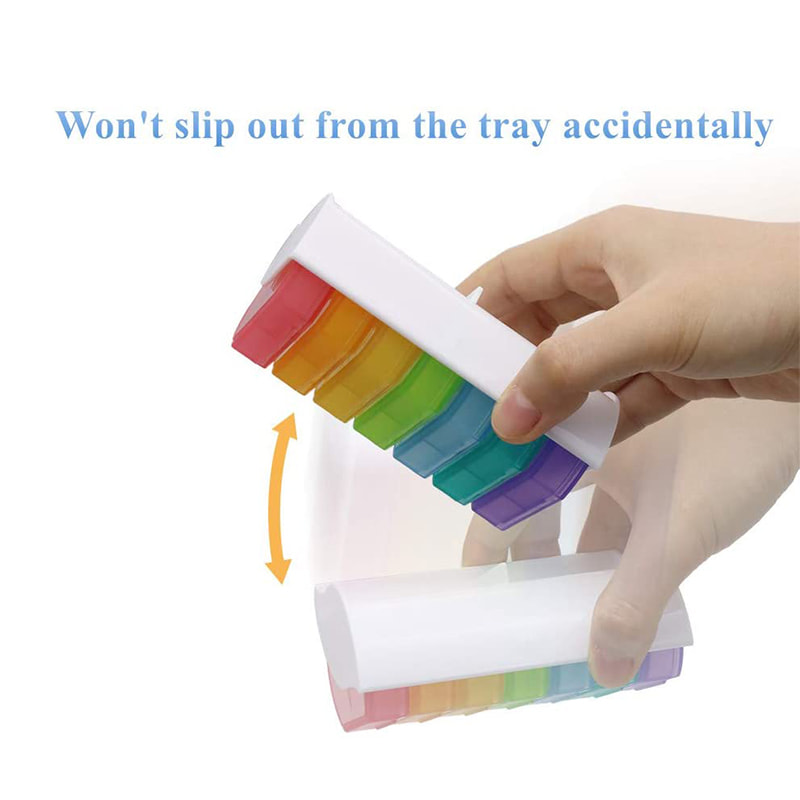 Datorită capacelor fixate pe fiecare compartiment, poți fi sigur că, chiar și atunci când scapi, pastilele vor rămâne în loc.