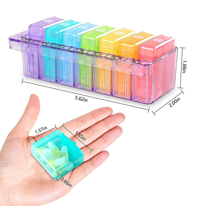 Dimensiunea totală este de 5,62" x 2" x 1,88"; Dimensiunea zilnică a cutiei de pastile este de 1,57" x 1,85" x 0,66".