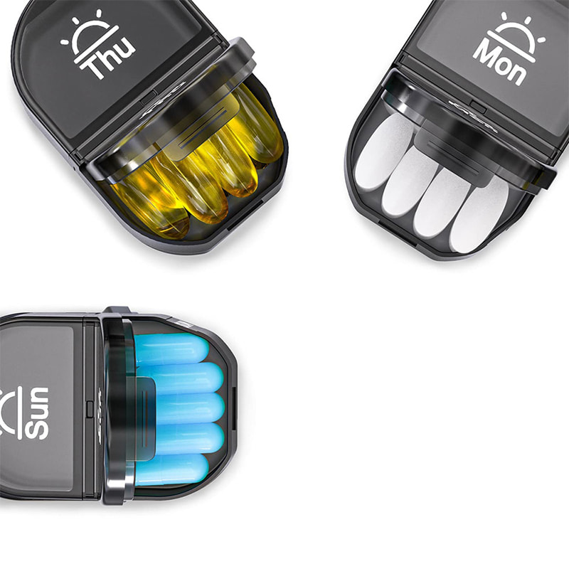 Poate ține o mulțime de pastile, vitamine și uleiuri de pește, iar dozatorul individual de pastile interior poate încăpea în buzunar sau în poșetă.